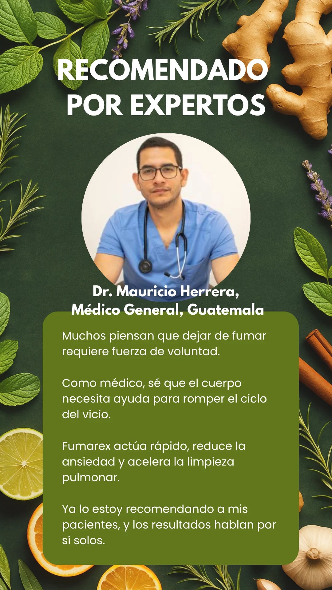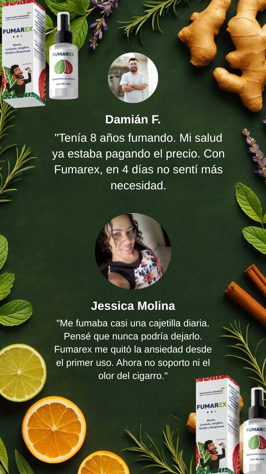 "Fumé por 20 años.Cada vez que intentaba dejarlo, terminaba peor. Con Fumarex, el primer día ya sentí menos ansiedad.Hoy mi aliento cambió, mi piel también. ¡Nunca más cigarro!"